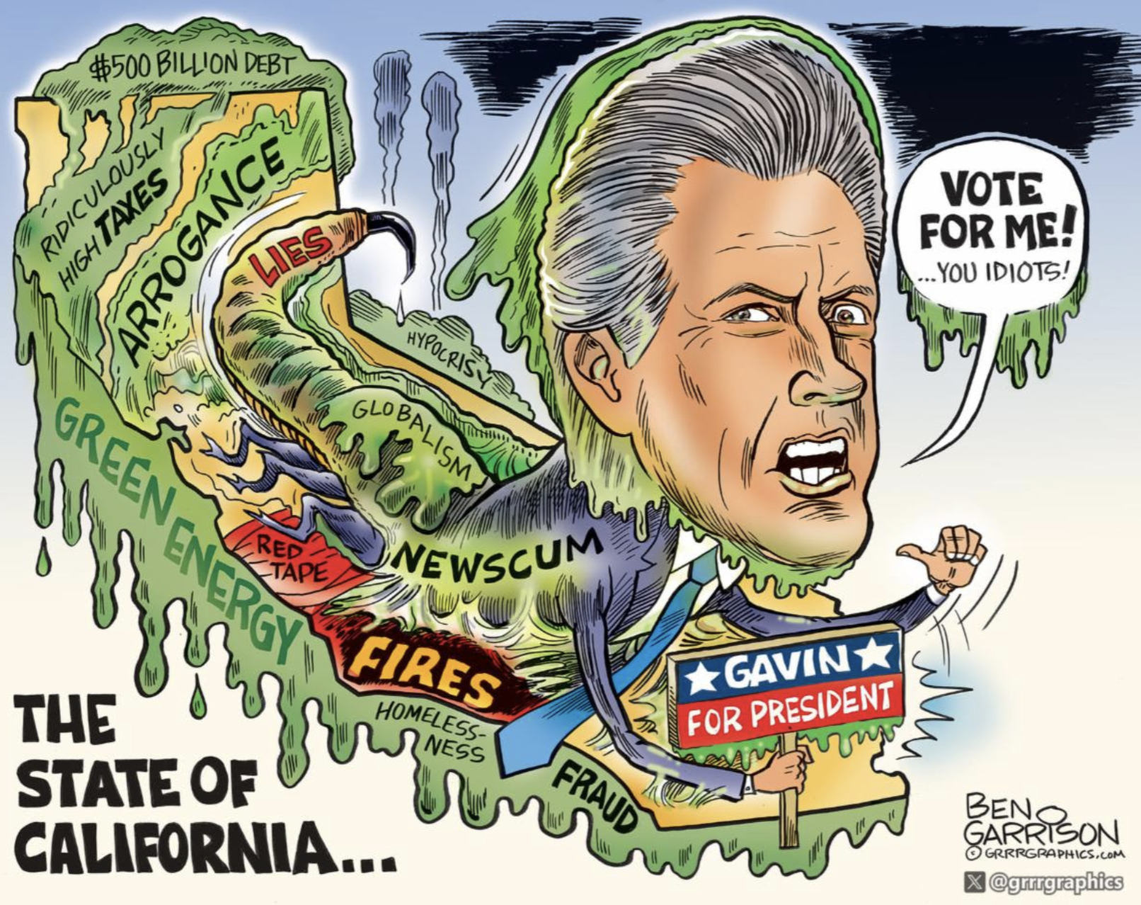 Gavin Newsom is a one-man tsunami, and someone who has severely failed California, as we now have highest cost of living in the U.S.; worst homeless crisis in the nation; failing public schools once lauded as the best in the nation; a devastating insurance crisis; failed, costly climate change policies; and oil and gas crisis; an agricultural crisis; a water crisis; the most criminal illegal aliens in the nation; the weakest election/voter integrity in the country; California has the most residents fleeing their home state in the country; and California has and had the most tyrannical governor in the nation during the covid flu outbreak – Newsom locked the state down for 3 years, ordered schools, churches, beaches and parks closed and off-limits to residents, forced small businesses to close but allowed six box stores and bath houses to remain open, all while he and the Mrs. traveled within the country, traveled abroad, and famously dined at Napa’s French Laundry restaurant, while his state was locked down and people ordered to mask-up indoors.