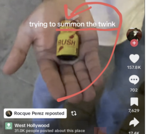 In another post with the caption “trying to summon the twink,” Perez promotes an illegal drug used by homosexual men that can involuntarily expand the anus of a young male. A “twink’ is a homosexual, teenage boy as young as 13.