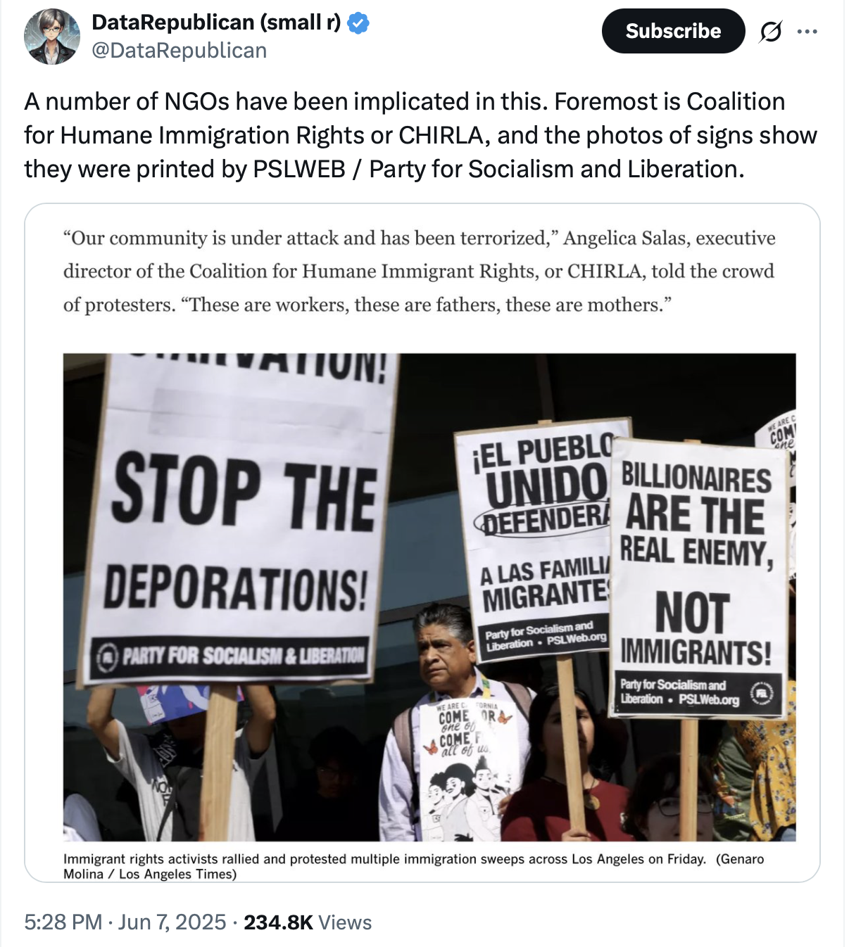 “A number of NGOs have been implicated in this. Foremost is Coalition for Humane Immigration Rights or CHIRLA, and the photos of signs show they were printed by PSLWEB / Party for Socialism and Liberation.”