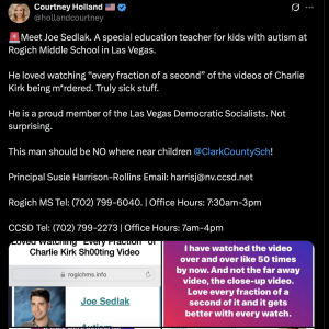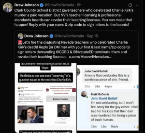 On September 13, three days after Kirk was murdered, CCSD promoted mental health resources available to students, parents and employees, to which Drew Johnson aptly replied, “Hear me out on this: One thing that also might help student mental health is not putting them in classrooms with teachers WHO F@CKING CELEBRATE THE ASSASSINATION OF AN INNOCENT PERSON.”