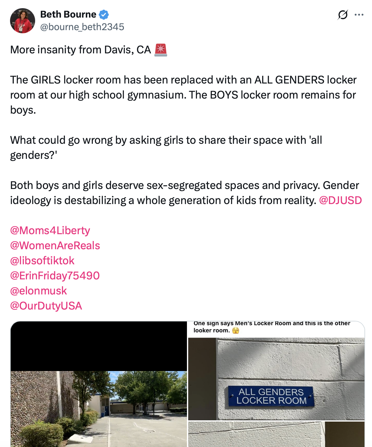 Bourne has filed at least 30 public records request from DJUSD. She filed another in April regarding the “All Genders Locker Room” issue at Davis Senior High School. Bourne said the girls locker room was replaced with an ALL GENDERS locker room at the high school gymnasium. The BOYS locker room remains for boys. “What could go wrong by asking girls to share their space with ‘all genders?’ Both boys and girls deserve sex-segregated spaces and privacy. Gender ideology is destabilizing a whole generation of kids from reality,” she said on X.