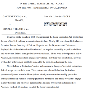 Federal Judge Declares Trump Violated Posse Comitatus, Allows National Guard to Remain in LA
