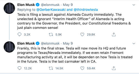 “Then Musk took to Twitter and announced he would sue Alameda County: ‘The unelected & ignorant ‘Interim Health Officer’ of Alameda is acting contrary to the Governor, the President, our Constitutional freedoms & just plain common sense!'” Musk Tweeted.