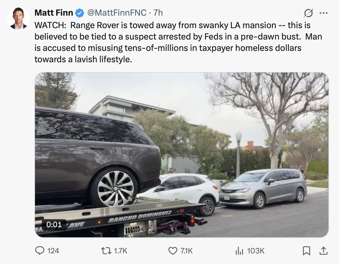 “Governor Gavin Newsom’s California just got CAUGHT in MASSIVE homelessness fraud, dishing tens of millions of dollars to a fraudster who used taxpayer funds to ‘live a luxurious life.’ HE IS NOT THE ONLY ONE. MORE fraud investigations are ongoing. The Trump DOJ confirms he spent the money on: – $125K Land Rover – Mansion – Second home in Greece – Luxury vacations – Designer clothes – Private schools – California is the fraud capital of America. We need mass audits and arrests.”