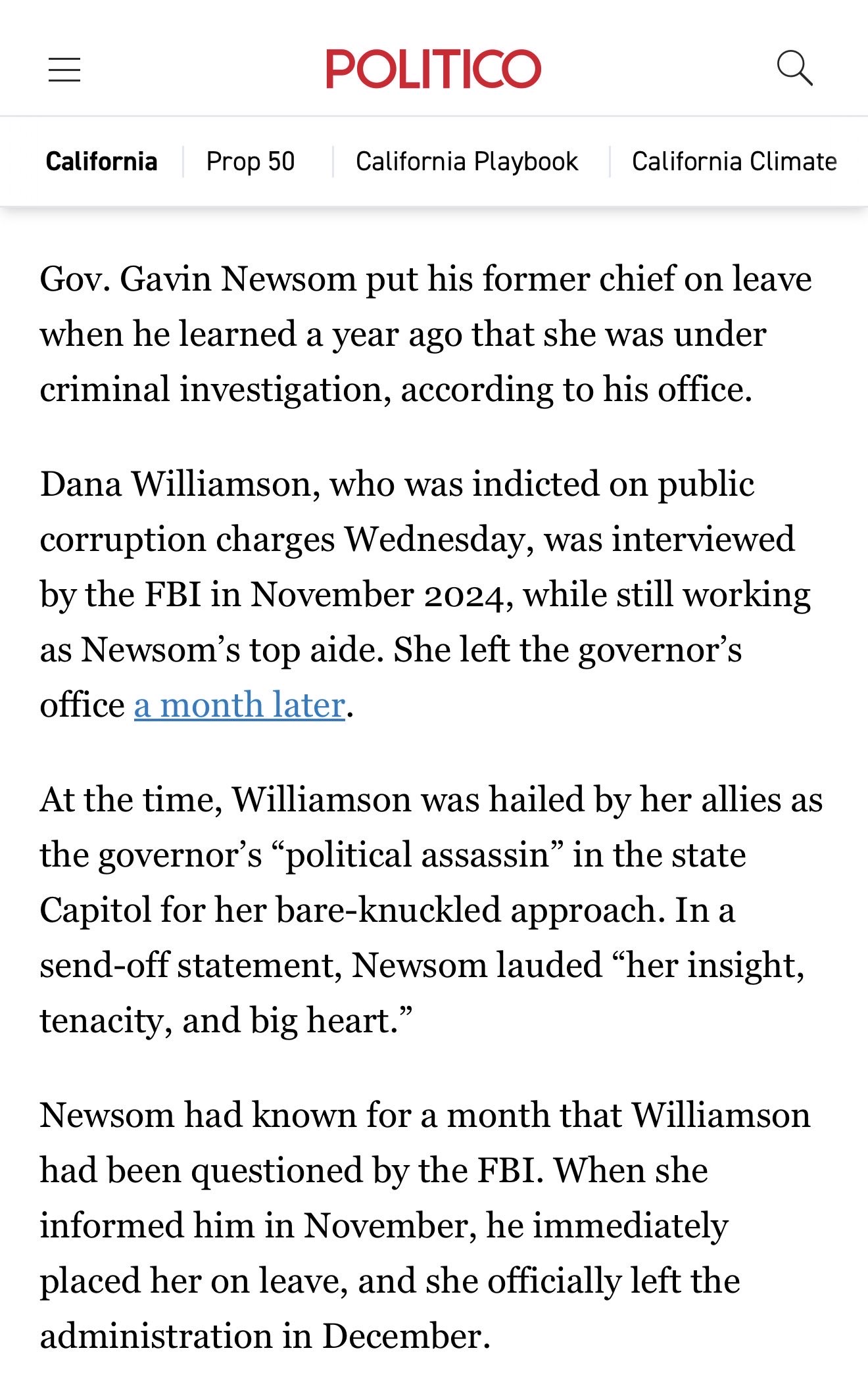 Gavin Newsom’s office initially denied that the governor knew anything about Williams, and distanced themselves from her. “Under the Trump administration, the DOJ routinely targets the state, which has resulted in us suing the federal administration 46 times,” a Newsom spokesperson said Thursday. But this investigation initiated during the Biden Administration in 2022, .