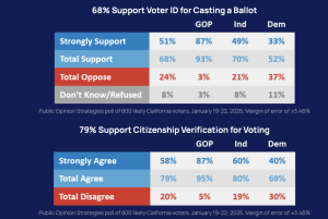 According to the latest polling data, a majority of California voters support the initiative’s requirements with 68 percent supporting Voter ID for casting a ballot and 79 percent supporting verification of citizenship.