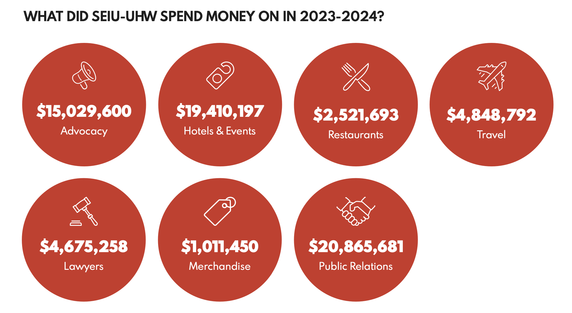 A little further digging from CUF found that the union spent over $15 million on political advocacy, $19 million on hotels and events, and $20 million on PR in the last two years.