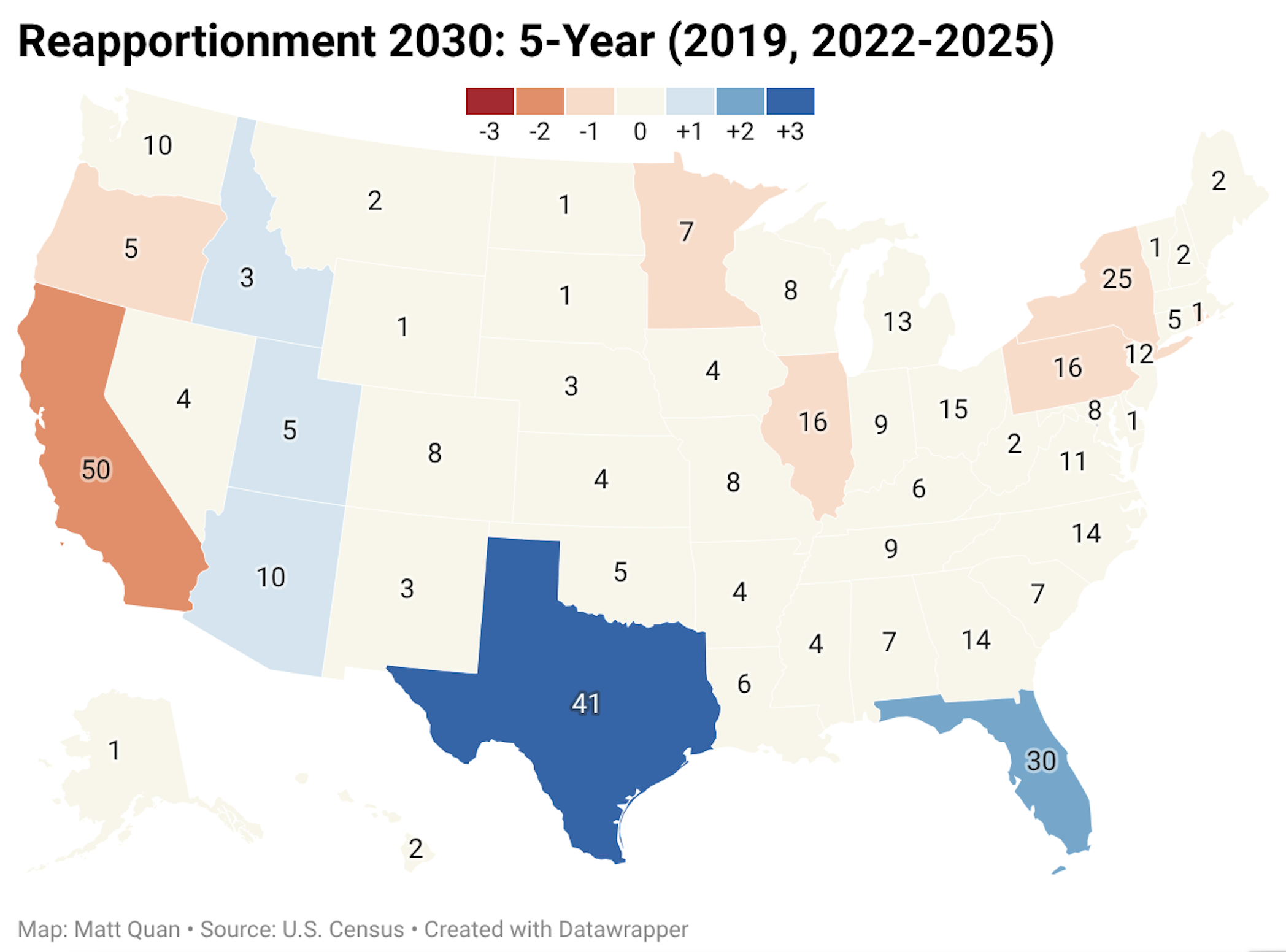 Most reapportionment and redistricting arguments are fixated on the Electoral College and White House or partisan majority in Congress. Texas and Florida will gain +3 and +2 respectively, and New York and Illinois will lose at least -1 each. More important is the loss of California political power, internal shifts within the state, and the underlying reasons why.