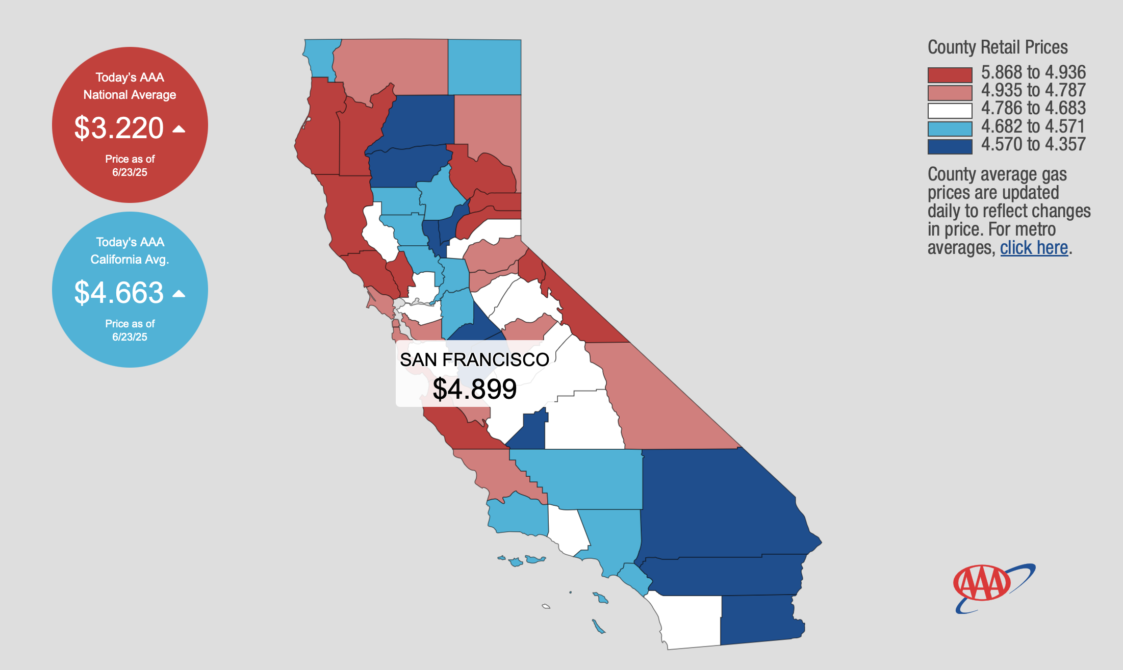 California’s highest price for a gallon of regular gas is $5.868 in Mono County.