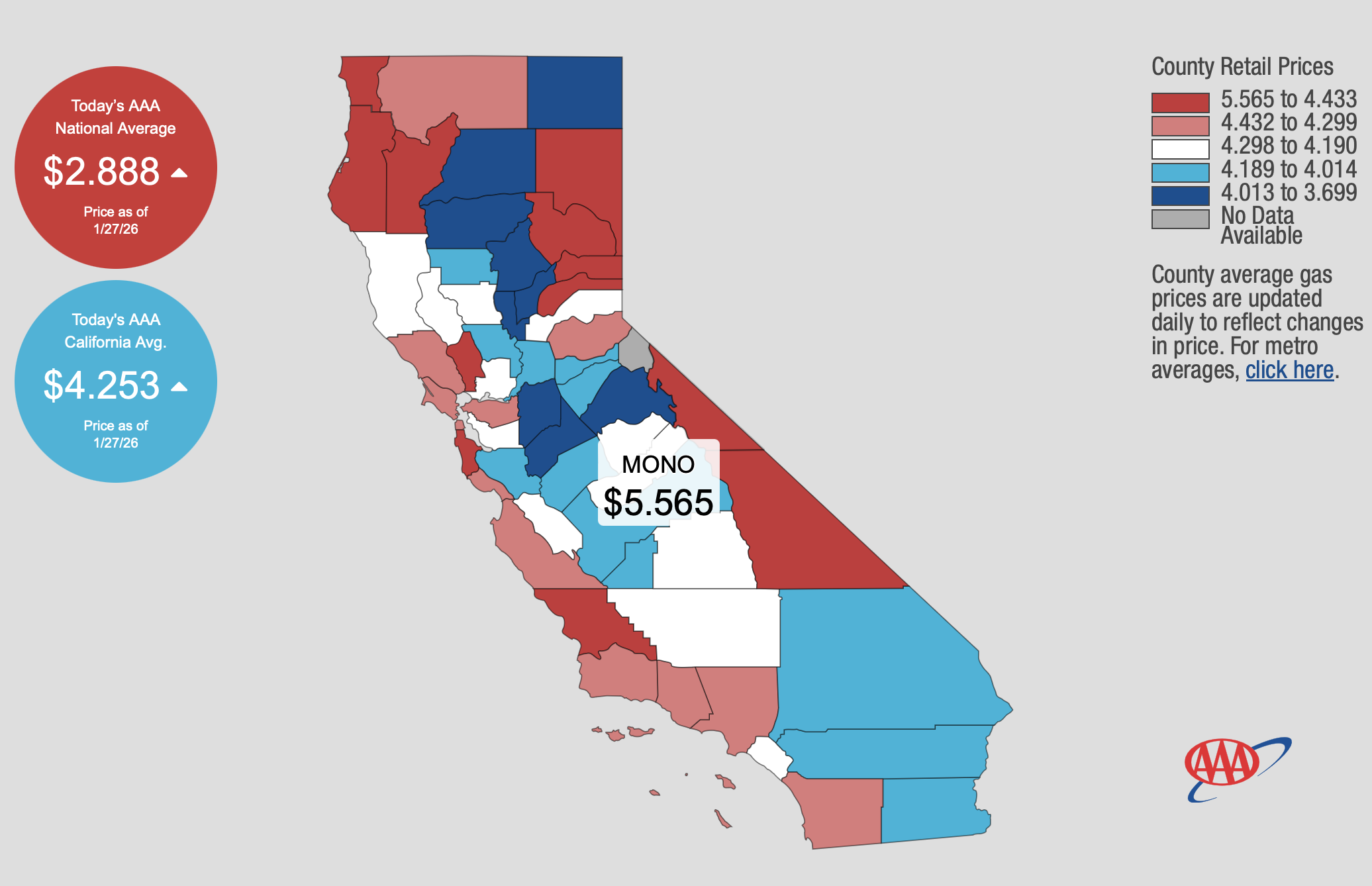 The average price for a gallon of gas today in California is $4.25. The highest price for a gallon of gas in California is in Mono County at $5.56.