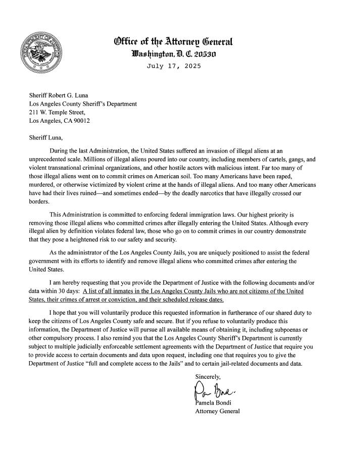 “Today, Attorney General Bondi sent letters to several California sheriffs—including Sheriff Robert Luna of Los Angeles County, the most populous county in America—requesting lists of all inmates in their county jails who are not citizens of the United States, their crimes of arrest or conviction, and their scheduled release dates. It’s time for California’s county sheriffs to fulfill their oath of office and keep the citizens of their counties safe and secure.”