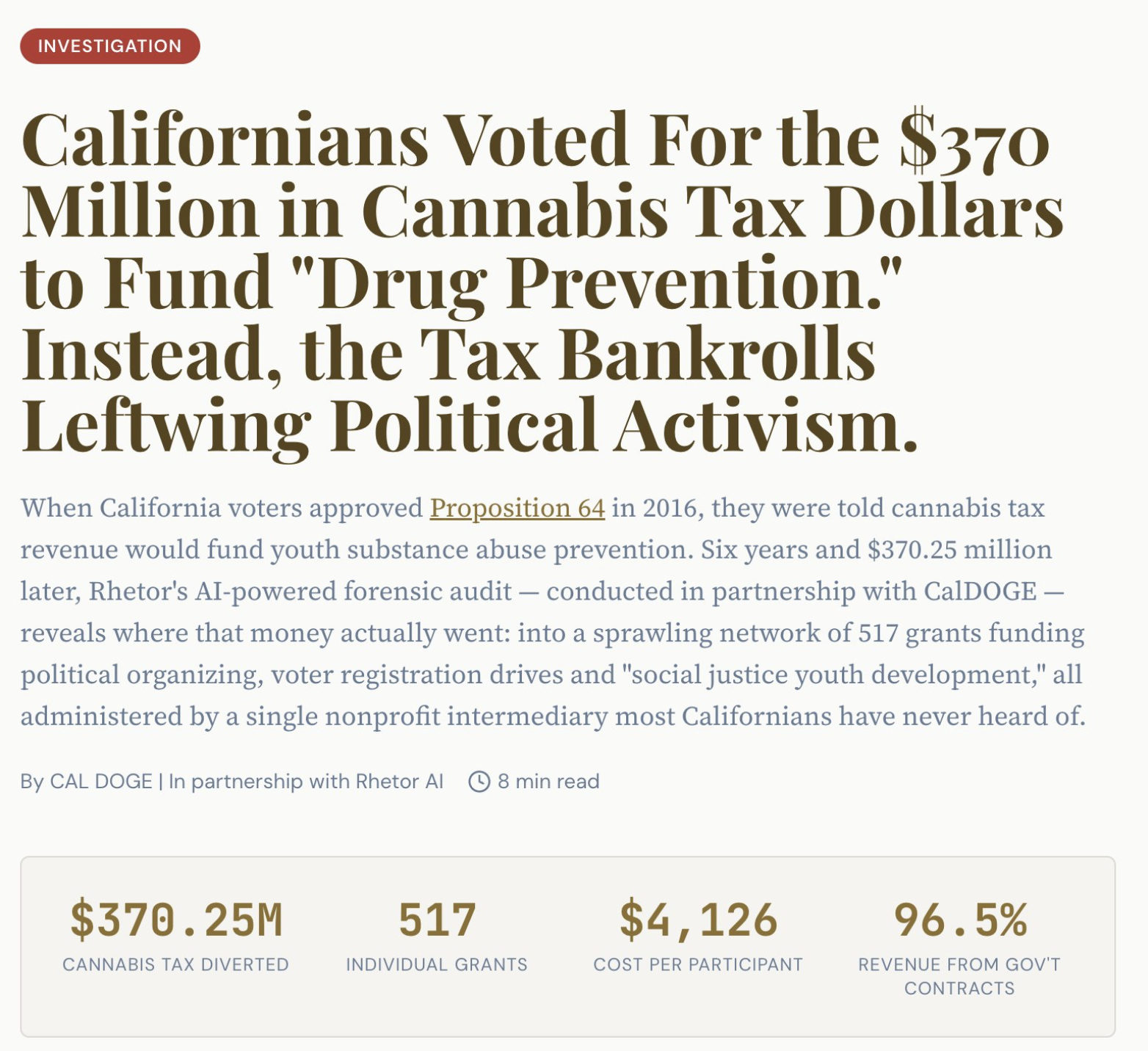 CAL DOGE, created by gubernatorial candidate Steve Hilton, announced it has untangled a web of funding from the Prop 64 authorized California Cannabis Tax Fund (CCTF) – supposed to be used for substance abuse prevention – that instead is building the Democrat political machine in California.