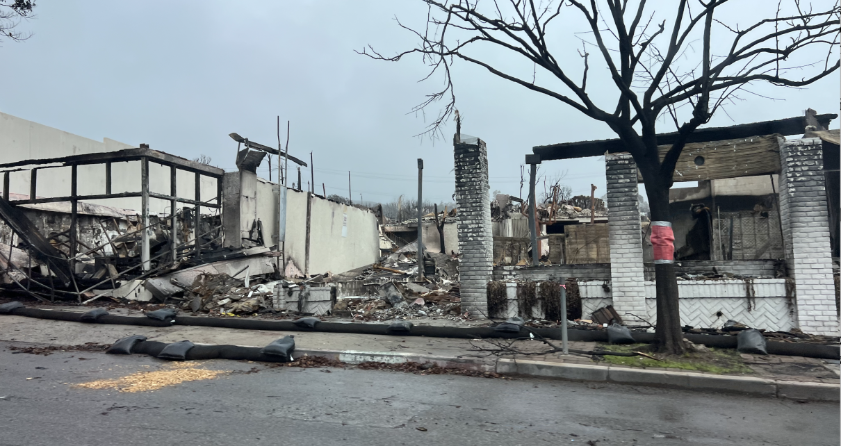 Pacific Palisades businesses burned down, car in driveway, Feb. 7, 2025. (Photo: Katy Grimes for California Globe)