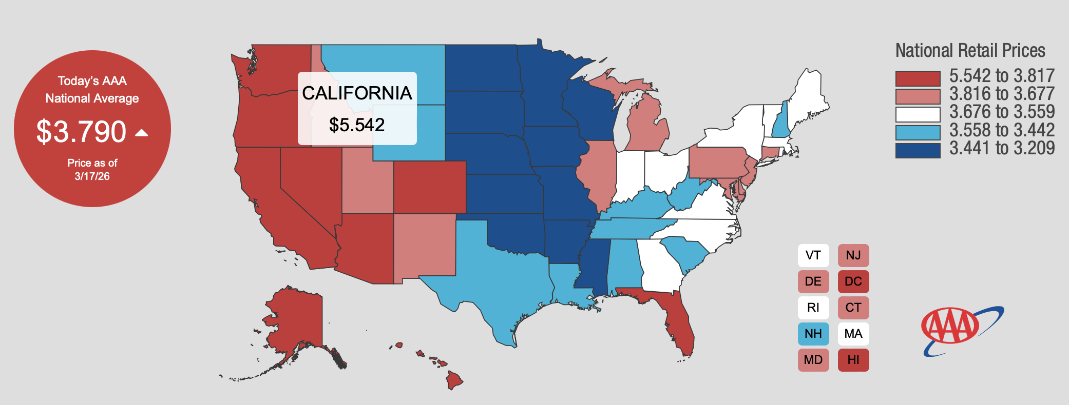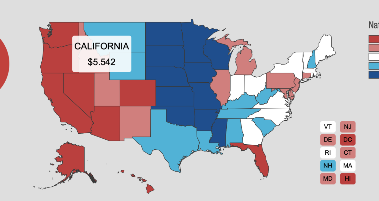 Here is AAA’s gas price averages today, with California’s average for a gallon of gas at $5.54 :