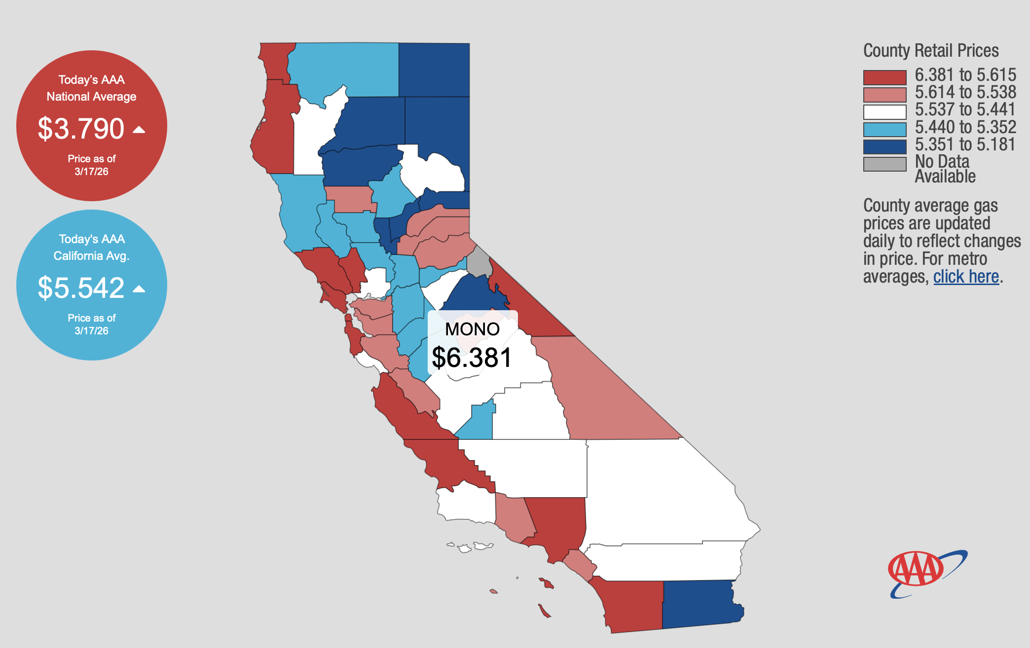 The highest gas price averages are in Mono County at $6.38 per gallon: