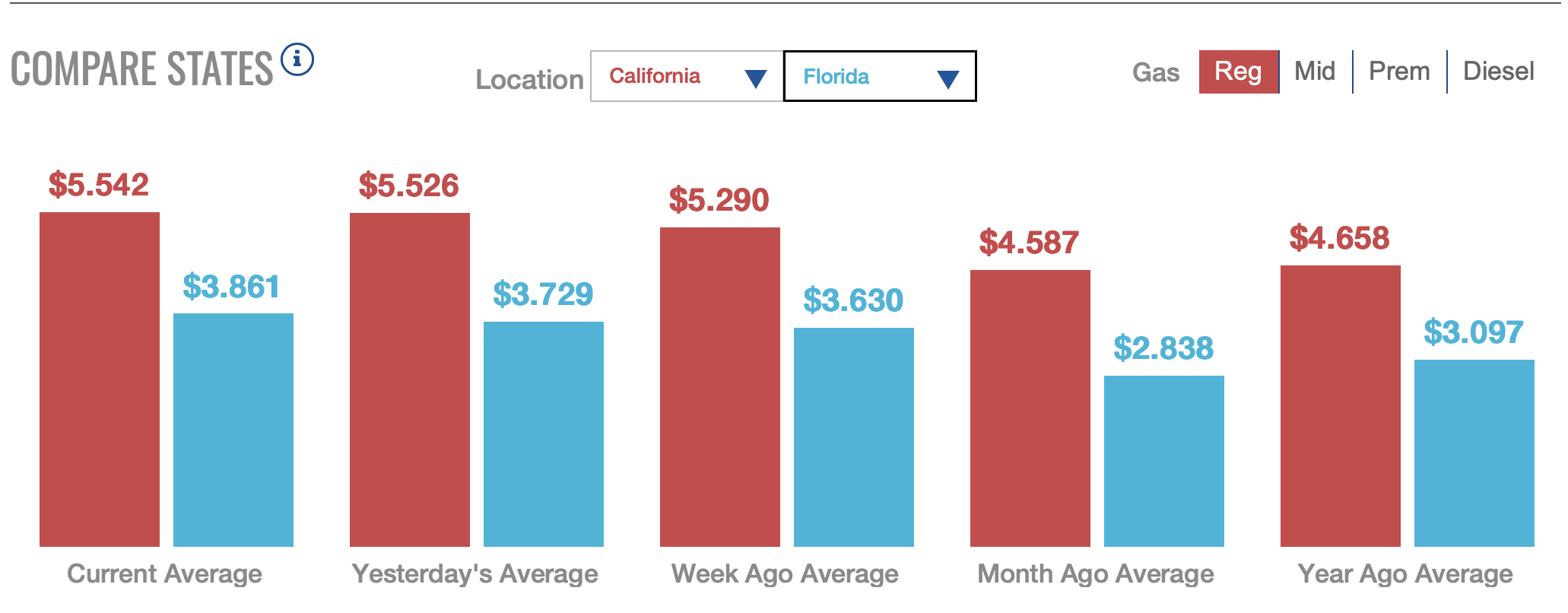 This is California gas prices today compared to Florida gas prices: