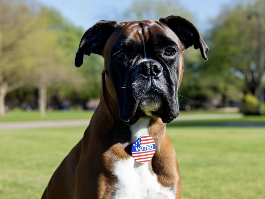 AI generated image of Maya the Boxer with an "I Voted" sticker (Photo created by Grok)