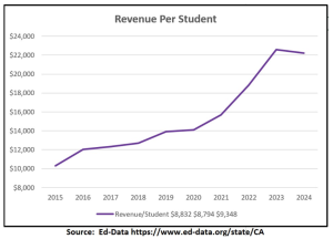 The California Department of Education data shows statewide K-12 funding has ballooned from $61 billion in 2015 to $114 billion in 2024, with per-student funding soaring from $11,181 to $24,222 (adjusted for average daily attendance), a growth rate of nearly 9 percent annually — far outpacing inflation. LAUSD mirrors this pattern, facing a projected $191 million deficit by 2027-28 if current spending trajectories hold, prompting the board to consider reduction-in-force measures and central office cuts of $150 million.