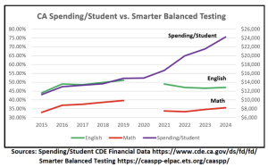 In 2024 only 47 percent of California students kids met standards for English, and a miserable 36 percent in Math. By all objective measures, academic performance in California has gone from bad to worse. According to the National Assessment of Academic Performance (NAEP) results, California ranks 38th in reading, while spending per pupil has skyrocketed.