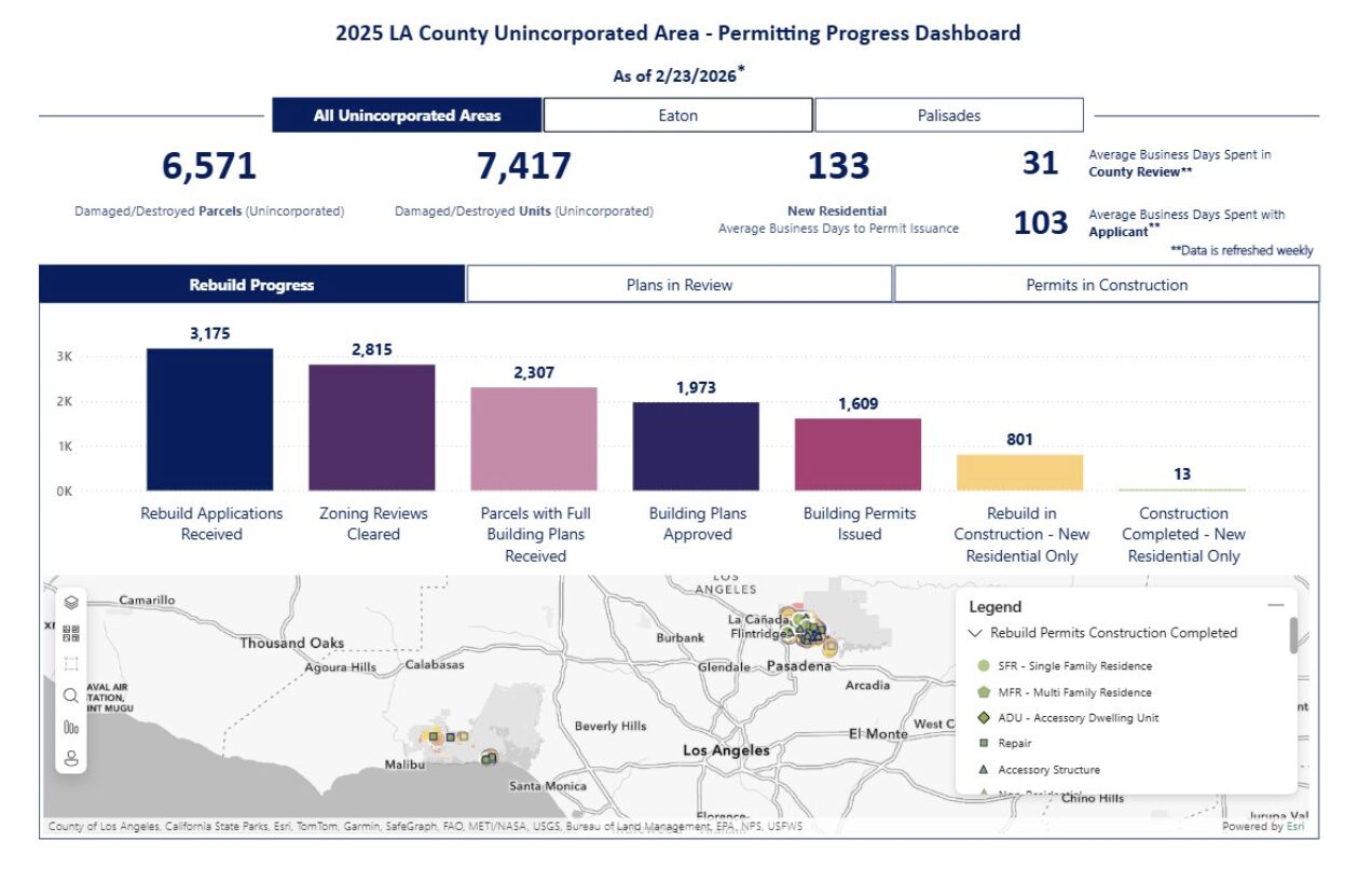 As of February 23, 2026, of the 6,571 homes destroyed by the Palisades Fire in unincorporated Los Angeles County, a total of 13 homes have been rebuilt, according to the official LA Recovers website. One home has been built in Pacific Palisades according to Los Angeles “LA Recovers.”
