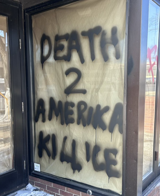 "Death to Amerika. KILL ICE" spotted on a window in Minneapolis, St. Paul, MN. (Photo: @Kevinposobeic on X)