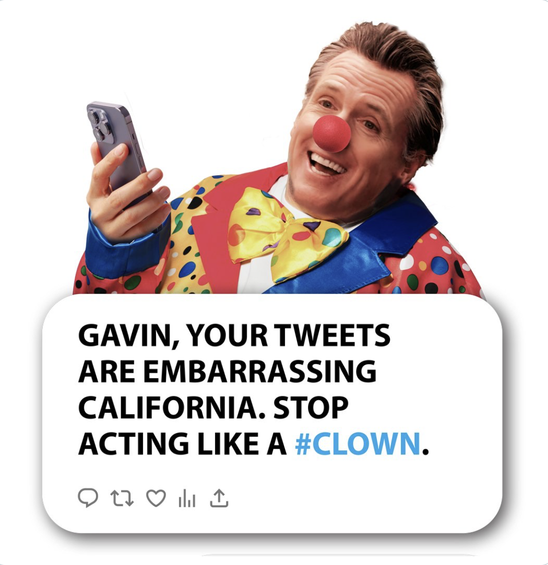 The ad reacts to the Governor’s ongoing social media frenzy and shows Newsom sporting a clown costume, holding up a smartphone, and features a mock X post saying “Gavin, your tweets are embarrassing California. Stop acting like a #CLOWN.”