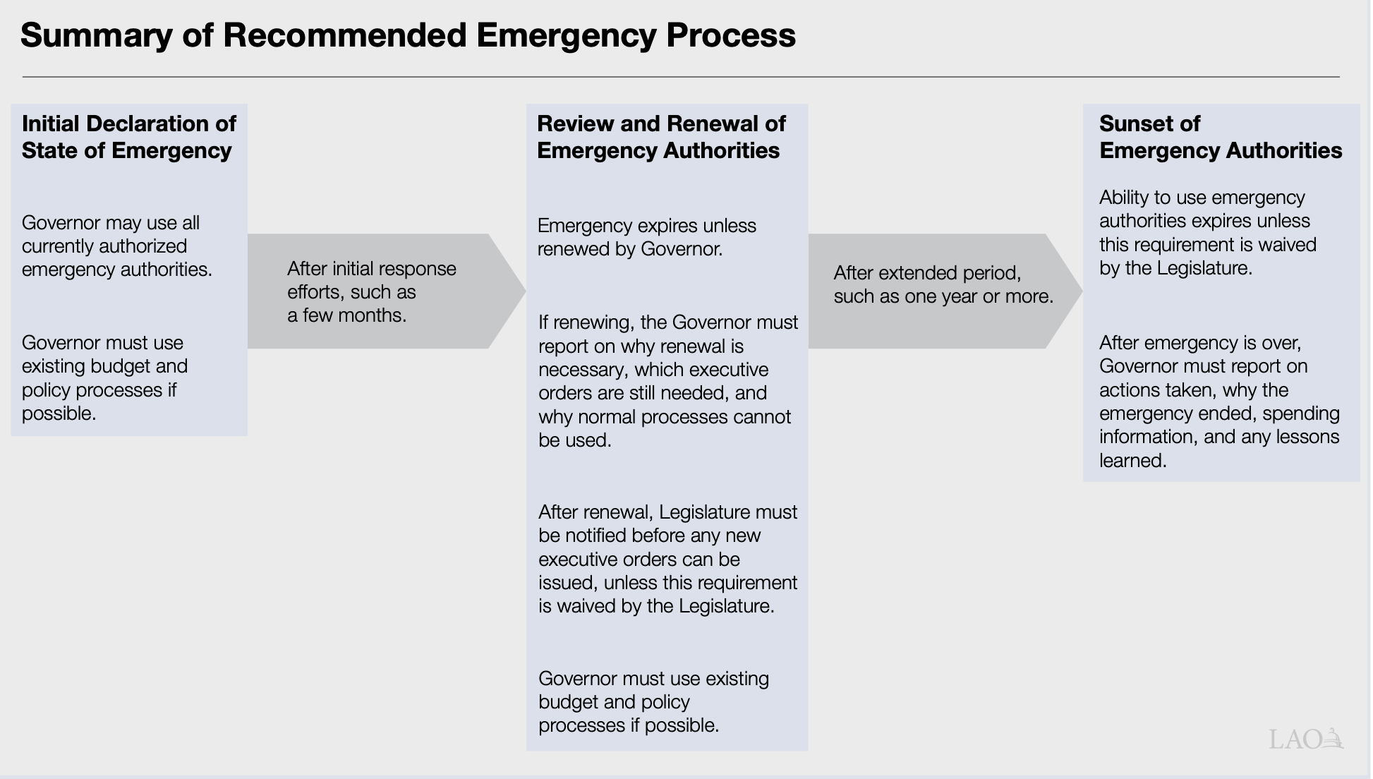 - No Process to Ensure Authority Is Promptly Restored to Legislature. There is no formal process to assess whether a state of emergency should remain in effect. This has resulted in many remaining open longer than necessary.