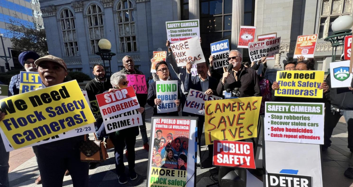 Edward Escobar speaking at recent public safety rally promoting the use of Flock safety license plate Reader cameras at Oakland City hall. (Photo Edward Escobar)