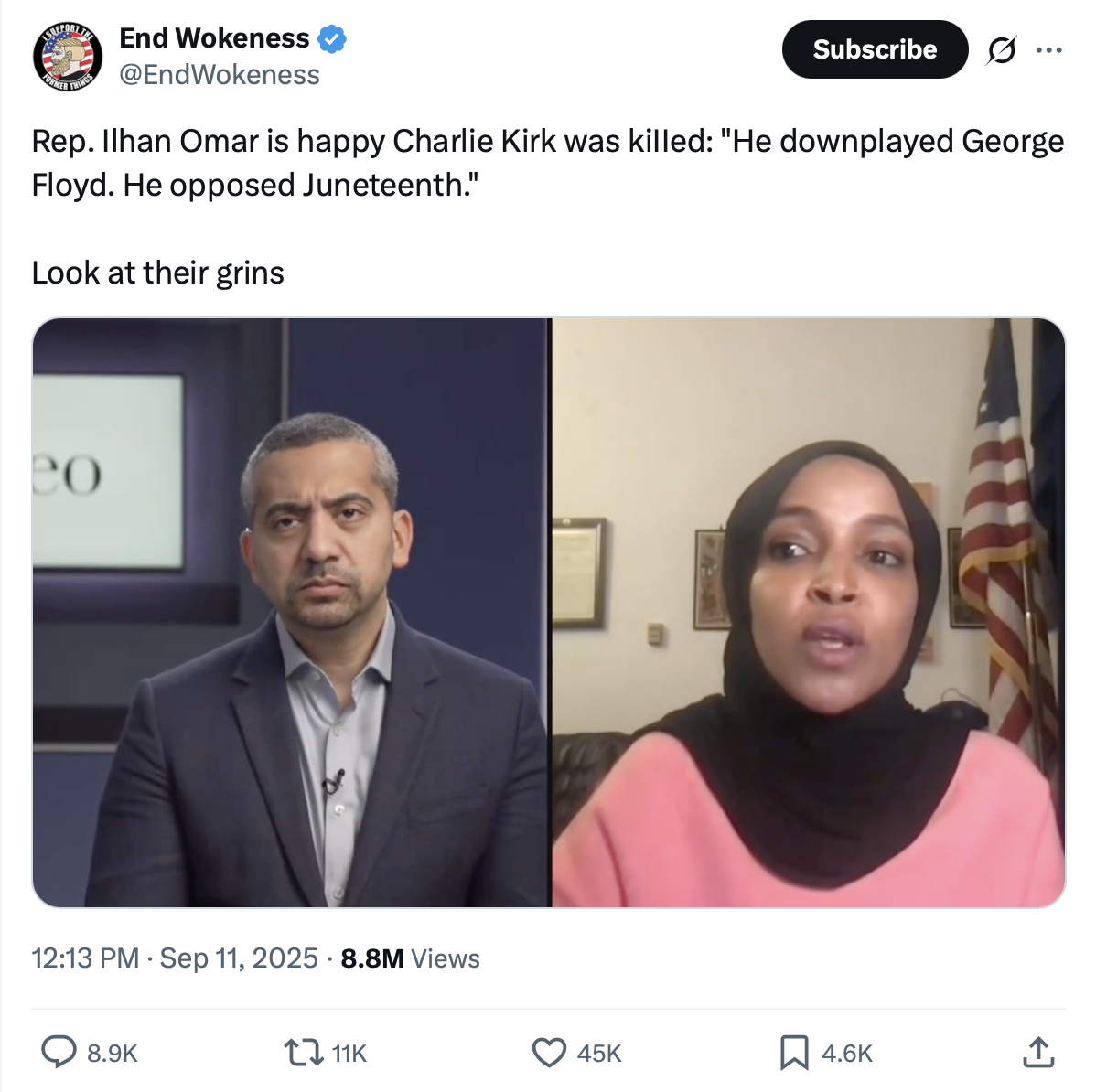 In the interview, just days after his murder, Omar mocked those mourning Kirk, claiming people who say “Charlie Kirk just wanted to have a civil debate” are “full of s—.” She added, “There is nothing more f—ed up than to completely pretend that his words and actions have not been recorded and in existence for the last decade or so.” When told that millions are mourning Kirk and that some described him as a civil debater, Omar dismissed their grief outright, calling it “complete rewriting of history.”