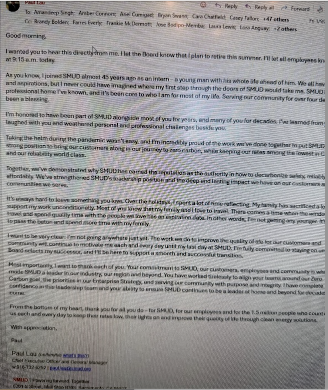The CEO and General Manager of SMUD announced he is resigning/retiring. He says his family has sacrificed a lot, and they “love to travel.”
