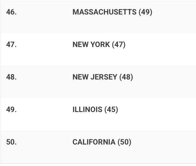 “While California’s exodus was greater than any other state, it saw a smaller net loss in 2025 than in 2024. Massachusetts, New York, New Jersey and Illinois also rank among the bottom five on the index” – notably all states with crushing taxes, insane regulations, and skyrocketing costs, and all blue states run by leftist governors.