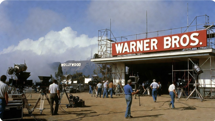 Warner Bros. movie set with Hollywood sign in background. (Photo: Grok)